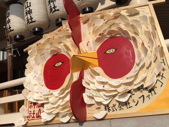 岡山神社では、その年の大絵馬が飾られるのが恒例となっていて、今年のデザインがこちら! 飾られたばかりの時は羽根はなしの状態で、小さな紙製の絵馬に願い事を書き、大絵馬に差し込むことで大絵馬に羽根が生え、立体的な鶏のお顔が完成するというもので、この三が日でだいぶ迫力のあるお顔立ちに様変わりしていました。願い事の数だけ羽根が増えるだなんて、とてもユニークですよね。こちらの絵馬は1枚500円。600枚限定ですので、大絵馬に願いを込めたい(羽根を生やしたい!)と思われる方は、どうぞお早めに!