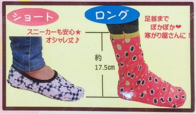 「モコモコそっくす」はショート丈とロング丈の2種類。ショート丈は足の甲を半分ほど覆うスニーカーソックスタイプで、ロング丈は足首が隠れる一般的なソックスと同じ形です。
