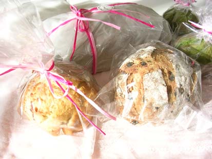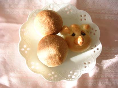毎日寒い日が続きますそれでも朝、明るくなるのがずいぶん早くなってきました昨日、また素敵なプレゼントが届きましたいつも元気でお料理上手♪美人さんの ふみちゃん と娘ちゃん からです♪甘さ控えめのスイーツに、梅干、紅茶と蜂蜜も♪それから娘ちゃんからは、ベビーピンクのかわいいマフラーです♪娘ちゃんの手作りです♪なんてうれしいプレゼントでしょう!!むすめちゃんとるいぃず♪かわいい~♪むすめちゃん、ありがとう(^・^)栗あん入りの甘食とモカマロンのケーキ♪甘食が優しいお味♪ 栗あんが練りこまれてるのね~そして、モカマロン、これはコーヒーのいい香りに栗が♪栗星人にはとってもうれしいスイーツ!!わぁい♪ おいしいですぅこちらは、りんごと練乳のパウンドケーキりんごのしゃり感が残っていて、しっとりなケーキです♪こちらも甘さ控えめなの♪ おいしい~!!♪アールグレイの紅茶と一緒にいただきました♪そして、むすめちゃんの手編みのマフラーです♪うさぎさんがモデルです♪かわいい!!むすめちゃん、ありがとう♪今日からいただいた、マフラーしてお仕事いきますね~♪うれしいです♪また、クッキーやケーキを焼いてお送りしますね♪ふみちゃん、むすめちゃん、ありがとう (^・^) * * * * *先日、お友達の あひるちゃん から、「塩パン」というのを知っていますか?とお尋ねがありました。ハイジの白パンの生地で塩なんだそうです。。。どんなものかしら。。。と思って、今朝、焼いてみました♪塩を生地の中に入れると全体が塩辛くなるかもしれないと思って今回、塩はトッピングすることにしました。パン生地は、ハイジの白パンのレシピです。強力粉 250g薄力粉 30g砂糖おおさじ1塩こさじ1白神酵母 小さじ1/2牛乳約120ccバター20gたまごの形にしてみました♪こちらは、シチリアの塩をトッピングにしました。結晶の粒がおおきいですそれと、青海苔とゆずの皮♪青海苔の磯の香りにゆずそして、がりっとシチリアの塩これはお食事パンにとってもいいかも♪もうひとつは、トッピングにクレイジーソルトとローズマリーですこれもね、クレイジーソルトがいい感じなんですが、スパイスがいろいろ入っているため、ちょっと物足りない。。。サラミの細かく切ったのを生地に混ぜ込むととってもいいかも♪どちらもお料理を選ばずお食事パンによさそうです。。。再度、サラミがベーコンを入れて作ってみましょう (^・^)