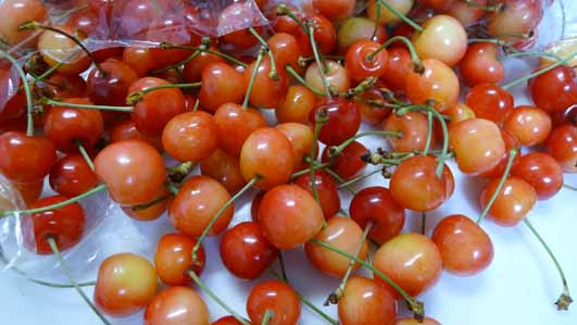 昨夜は台風が通過し、雨風の音で眠れませんでした。 朝になって台風が過ぎ去るも、また5号台風が近づいています。 心配です。 みなさんのところも被害が出ませんように。 明日はもう夏至なんですね。 雨が降ると寒いので夏という感じがしないですが、夏至です。 そして、今年もかわいい姿が登場しました。 かわいくって、甘酸っぱい さくらんぼ♪ 私はフルーツはいちごがすき。その次は桃や葡萄、メロン、、と続きます。 食べごたえから言ったらさくらんぼは1番ではないのだけど、 このかわいらしさは他のフルーツはかなわないと思う。 癒しの果実。 見てるだけで幸せな気分になれて、その甘酸っぱさに胸がきゅんと なるのです。 今年もどうぞ、やまがたのさくらんぼをご贔屓にね (*^_^*)