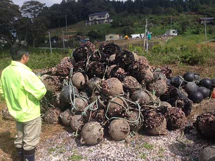 ご無沙汰しています~ 週刊が膈週になってます 先週23日から25日まで横浜へ行っていました そして29日の日曜は久しぶりに南三陸の歌津へ行ってお手伝いをしました 今回は浮きに張り付いたフジツボや海藻をナイフでそぎ落とす作業をしました フジツボがいっぱい着くと浮きが沈んでしまうそうです お昼は恒例の海鮮BBQや、さんまのお刺身、ホヤのゆがいたものなど盛りだくさんでした ちびっこのホヤですが、これがとっても美味しかったです 柔らかで潮のふくよかな香り。。ホヤがこんなに美味しいなんてびっくりしました さんま、ほたて、つぶ貝 切りもちまで焼いて 食べておなかいっぱいになりました 快晴で海もおだやかでした この後、すこし離れた戸倉という浜辺へ行きました 明日は戸倉の様子をアップする予定です(*^_^*)