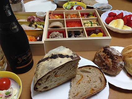 朝、起きたら、積雪1センチほど 風が冷たくて時々暴風警報がでました 早くあったかくなるといいなー さて、昨日の続きです キッチンに放置していたパン生地は室温が低くてあまり発酵が進んでいませんでした 1次発酵は9時頃までかかりました その後、ベンチタイム、成形、ホイロ そして焼成 3つのボウルの生地はこんなパンになりました まずは、バゲット やっぱり久しぶりなので、クープクラムもなってない、、、orz フランス産小麦150g 水120cc 塩4g ドライイースト 0.2g フランス産小麦なので、色が小麦色に焼き上がります 無漂白なんですね。お味はしっかりしています そして、カンパーニュ 形が悪すぎますね、、 フランス産小麦 250g 水200cc 塩5g ドライイースト 0.3g クラムはいい感じにできました このお味が好きなんです 最近は何も入れないカンパーニュがすきです シンプル イズ ベスト♪ さて、最後はこれ 生地に200gものバターを折り込みました 3つ折りを3回繰り返し、三角にカットしてくるくる巻き、ホイロして焼成 クロワッサンです フランス産小麦300g 水 170cc 砂糖30g 塩5g バター20g 折り込みバター200g 焼きすぎたなぁ。。うまく層ができませんでした。。。 いきなりハイレベルなものばかり焼きました 一番難しいのを最初に持ってきました。というか、私の好きなものが難しいものばかりというのが 正しい。。 難しいは易しいを兼ねるので、難しいのからやるというのが私の信条というか、やり方です、、 課題はてんこ盛り しっかり焼けるようがんばりましょう