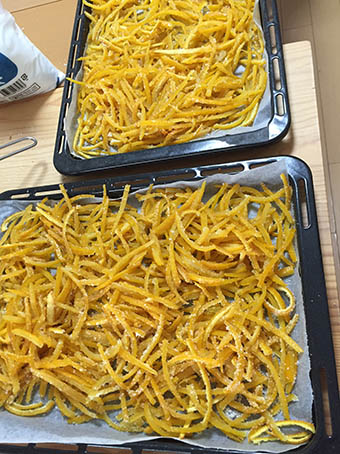 前夜、サッカーの決勝の模様をテレビで見てしまって完全寝不足、準備不足 ですが、10時にみなさんやってきて、大量(30個以上あったかも・・)の夏みかんでジャム作り が始まりました 前回は3人で作ったので、一日かかって大変な作業でしたが、今回は5人なので作業が早い♪ と思ったけど、コンロが2つしかなくて、私がお昼のためのチキンのクリーム煮を作ったりケーキを 作ったりしたので、肝心のジャム作りが進みません、、 中身がいっぱいあるという事は、皮もいっぱいあって、大量のピールができました ジャムが夕方できあがりました お昼のために焼いたパン 昨年ご結婚されたカニー夫妻のためのケーキ きよちゃんにお手伝いいただきました 下がレアチーズケーキ 上がマスカルポーネのムースです 楽しかった! 美味しかった! おなかいっぱい! でつかれたぁ。。