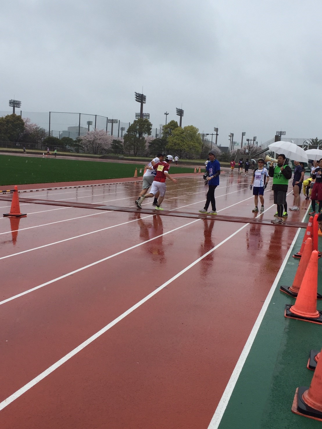 雨に撃たれてカラダが冷える中、前のランナーが競技場に戻ってきた。