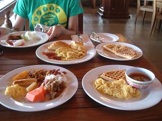 今日から2泊3日でティオマン島へ映画「南太平洋」の舞台になったことで知られる島です。日本出発前にレンタルしてみようと思ったけど、近所のツタヤで扱ってなく、結局見ないまま行くことに。。。朝、ダンナくんの出勤に合わせて家を出る。ダンナくんの会社まで一緒に行き、会社近くにある「 ESTANA CURRY HOUSE 」で朝ごはんを食べる。もちろんRoti系とTeh Tarik。この組み合わせ非常にカロリーが高いです。やばっでも、やみつきになるくらいとっても美味しいの~ 滞在中何回食べたかな?*Roti系とは・・・ロティ・チャナイという油たっぷりのパイ生地を 焼いたパン?がベースで中に色々入っているもの。*Teh Tarikとは・・・コンデンスミルクたっぷりの紅茶選んだのはRoti Kaya(ロティ カヤ)RM1.50 *カヤジャムというココナツミルク・卵・砂糖等で作ったジャムが入っているものTちゃんは飲み物だけオーダー 朝 食べないの?朝から高カロリーなものを食べてる私。飲み物だけのTちゃん だからスリムなのねぇ~朝食後、またまたドライバーのHさんにスバン空港まで送ってもらう。ほんとHさんにお世話になりっぱなしです。てりまかし ばにゃばにゃ。 かなりさびれた?スバン空港から ベルジャヤ航空のプロペラ機でティオマン島へ 人があまりいない空港でした。出発も約45分程遅れましたが、みんなイライラすることも無くのんびり待ってます。一度機内に乗り込んだものの空調の点検?の為に降ろされ、GATEで待つはめに・・・ベルジャヤ航空182 スバン空港発 1050 ティオマン着 1150着陸直前 プロペラ機から見たティオマン島の海の色 かなり綺麗で期待大!島に着くと日差しが強い。まぶしくて目が開けられない。KLとは違う気候を感じる。常夏の島のようだわ。きらきらしてる。ん~ リゾート地に来た~って感じ♪でも、ここ空港? 他にプロペラ機もいないし、広い駐車場って感じです。ホテルにはシャトルバス?で連れて行ってくれました。同乗した皆さんほとんどが同じホテルでした。Berjaya Tioman Beach Golf & Spa Resortプルメリアやハイビスカスも咲いていました。ホテルに着いたのは1300過ぎ。チェックインの手続きをするとまだ部屋が用意できていないから、先に「Matahari Beach 」でWELCOMEDRINKでも飲んでリラックスして下さいと言われ荷物だけ預かってもらい、早速お昼も食べることにしました。景色と波の音に癒されるながらとる昼食 なんて贅沢な時間なの~あ~ もう日本に帰りたくないー。お昼は肉骨茶(バクテー)ならぬ、CHI KU TEH(RM17.0)KLで肉骨茶を食べる日がなさそうだったので、似たようなCHI KU TEHを食べる。漢方のスープの中に鶏肉、野菜、油揚げ? おふが入っています。味は・・・薄い。本物の肉骨茶の味を知ってるTちゃんに味見をしてもらう。うーむ。何か違うらしい。ゆっくりとお昼ご飯を食べた後、改めてチェックイン。部屋も用意が出来ていました。部屋はデラックスルーム♪ ラッキーと思っていたらなんと! ダブルベッド だった~ きゃー どうしましょ?(*^^*)ポッ予約の時はツインで予約したらしい。Tちゃんがフロントに「部屋を変えて~」と交渉してくれたけど、「ツインの部屋は少なく今日は空いてない」と言われる。ここで引き下がる私達ではない。今度は予約した旅行会社に電話してホテル側と交渉してもらう。ただひたすら旅行会社からの回答を待っているのでは時間がもったいない。ということで、部屋の前に広がるビーチでまったりしに行く。まったりのんびり過ごしていると、Tちゃんの携帯に旅行会社から電話が・・・結局部屋を変えてもらうことは出来ず、エキストラベッドを入れてもらうことになりました。部屋に戻ってベッドメイキングの人を待っていたらエキストラベッドを持ってきてくれました。しかし、部屋の前にただ置いていっただけ。えっ? セットしてくれないんですかぁ~?仕方がないので2人で運び入れてベッドをセット。かなり錆びれてるベッドなんですけど・・・このベッドで寝て大丈夫?マットもしみだらけ。しばらくすると、部屋をノックする音が聞こえました? ん? 誰だろ?シーツと毛布を持ってベッドメーキングの人が来てくれベッドメイクしてくれました。なぁんだ 待ってれば良かったんだね。とりあえずベッドも出来て一安心、ホッ。夕方からは近くに散歩に行きました。暑かったし、坂道がきつかった。きつめの坂道 ふた山越えたところでやっとお家やお店が見えてきた。結構しんどいわ。途中、猫やお猿さんもいました。猫は人懐こいのかあとをついてきます。このままずっとついてこられても困るのだけど・・・道端には可愛い花が咲いていたり、パパイヤの木があったり・・あ~ やっぱり南国だわ~ 汗をかきながらまた今来た道をふた山越えて戻ると、ホテルのゲート前にイグアナがいる。うっ でかい。怖い。Tちゃん 全然動じない。むしろ近づいていって写真取ってるぅ~Tちゃんがいるから大丈夫と自分に言い聞かせ、私も恐る恐る近づき写真を撮ってみた。ホテルに戻ってくると