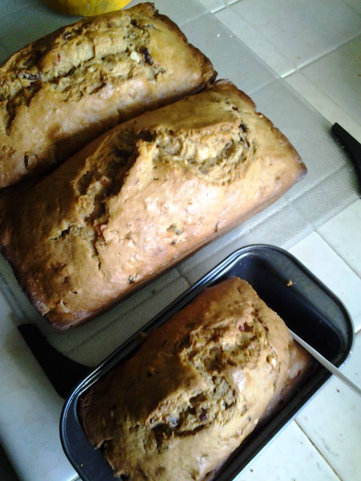 何故私がバナナ・ブレッドをちょくちょく作るかの説明は この前載せましたよね。そうでなくても、コストコで一房 200円以下で売ってるバナナは行くたびにかうので、 数日後は熟れすぎてしまうから、冷凍にするか、パンに してしまうのです。それで、簡単かどうかは主観なので わかりませんが私には凄く簡単でレシピなしで作ります。 フェイスブックでレシピの公開を頼まれていたので、 思い出して書いてみました。アメリカのメジャーですから 日本の方は計算しなおしてみてください。いつも二倍で二斤 焼きますが一斤ようのレシピです。 A (全部をミックスしておく) 1 3/4 カップ小麦粉 1/2 小匙 塩 1/2 小匙 重層 1 小匙 ベーキングパウダー 1 小匙 シナモン粉 1 小匙 あるなら・・・All spice オールスパイス (なくても良い) ーーーーーーーーーーーーーーーーB 1/2 カップ クルミ 1/2 カップ レーズン(あれば、二色) 1/4カップ 干し・クランベリー (これも、私が勝手に入れてるから無くてもオッケイ) 1/4カップ フルーツミックス(クリスマスにフルーツケーキに入れる、 かんきつ類の皮の砂糖漬けを細かく切ったもの)無かったら入れなくても大丈夫。ーーーーーーーーーーーーーーー 1/3 カップ バターか、マーガリン 1/2 カップ 黒砂糖 2 卵 1 カップ。マッシュド・バナナ________________ ミキサー(小麦粉をこねる機械)にバター、卵、砂糖をいれミックスAの材料と バナナを、数回にわけ交互にいれ、ミックス。Bの材料をドバーといれて、機械なしでミックス。一斤用のべーキング容器に流しこみ、350度Fで、50分くらい。