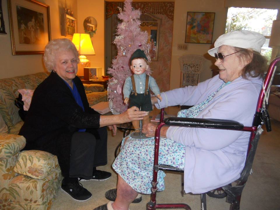 最近はいった、コーラスグループで、昔の歌やら最近の私は知らなかった歌などをうたってますが、その中に、「チャンスは必ずある」という曲があります。その歌詞に、まだ、大丈夫チャンスは必ずある♬ というのがでてきますが、今面倒をみてるベティーにも同じ事を言って励ましてます。11月に始めた頃は、ベットからでたがらず、トイレに行かなければならないたびに、大変な思いで起き上がって車いすにすわるので、「死にたい」を繰り返して泣いていました。私は、チッ!と舌をならして、「我々女性も男性のようにホースがあれば用足しもビンで簡単にできるのにね」と言ったとたんに、ゲラゲラ笑って立ち上がると言う風でした。 11月から、人形コレクターの友達(左)ベティーを訪問したがってましたが、電話の度に泣いてことわっていたのです。見てください。今ではちゃんと歯をみがき顔をあらい、私が髪をとかして洋服をきせたら、生き生きとして、応接間に数か月ぶりで出てきましたよ。私がベティーの世話をするようになってからは、使い捨てのお皿やコップでなく、食事をちゃんとした陶器の食器に盛り付け、缶詰とか冷凍食でなくバラエティーに富んだメニューを考え、ちゃんとデザートや、スナックまで出してます。それに、ベットの上でなくちゃんとテーブルで食べるようになり、笑い話を沢山して、いっぱい笑っているうちにトイレに行くのも自分で出来るようになり、泣かなくなりました。そして、昨日はやっと、11月から見送っていた友達の訪問も楽しんで、新しく買った人形をみせにきたシェリルと、思い出話で大笑いしたりでもう、次の訪問を心待ちにしてます。私が帰るときは必ず「アイラブユー。ヒロコはやさしくて大好き。今度はいつくるの?」と聞きます。ベティーは、まだまだ大丈夫。つまり、人間は可なりのところまでは自分の「気」でコントロールできるのです。 生きよう、生きたいという気を起させるだけで、かなりの事が出来るようになりますよ。