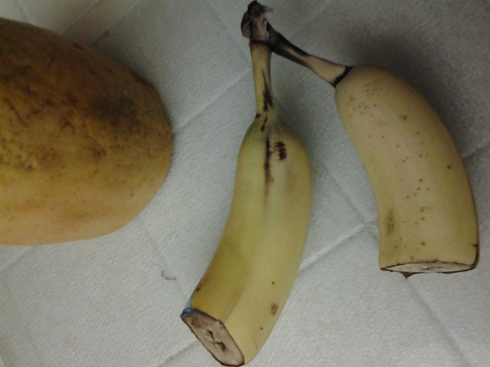 今朝起きたら、バナナがこんな風になっていた。 ネズミ男(何だかいつか、こういうあだ名になった)夜中にちょこっと、バナナを半分食べるのはいいが、その翌日また半分食べるなら、残りのをたべればいいのに、又新しいバナナを半分切るのだ!だから、無駄をださないために私はバナナ・ナッツ・ブレッドを作り続けることになる。 さて、今朝その半分+半分のほかにも、また新しく買ってあったバナナでバナナ・ナッツ・ブレッドを焼いた。そして、ちょいと台所でさましてからフォイルに 包むつもりで、茶の間に本の5分くらいいた時、台所でこそこそ音がする。「あれ?ネズミ男、まだ寝てるはず」と、台所に行ってみたら、まだ、ホカホカの パンが、もうこんなになっていた。「ちょっと~。二斤半やいて、小さいのをハイジに持っていく計画だったのに、何故一言食べていいかな?と聞かないの?」と怒鳴ったら、「小さいのは、僕のだとおもった」と勝手なこといってる。「一人で暮らしてる女性に持っていくけいかくだったのよ~。食べちゃったなら大きなのを彼女に上げなければならないじゃないの。もう、本当に!油断もすきもあったもんじゃない!」と、私は文句をいう。 ハイジは75歳になるドイツ人の女性、一人で住んでるから大きいのじゃ食べきれないのだ。だからといって、半分に切るのもへんだから、仕方なく、大きなのを一斤持っていくことになった。ネズミ男の食べる分が減っただけだから、まいっか!
