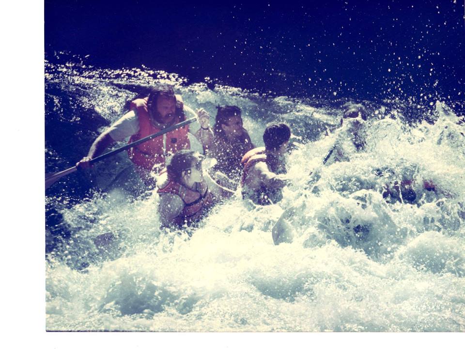 1987年、当時のユーゴスラビアからの交換学生で私の娘となったジュリー が国に戻る前に連れて行ったアメリカンリバー・ラフト・ライド。私は、すぐわかるでしょう?私の左がジュリー。ここは、2メートルくらいですが、ほぼ直下ドロップなので一人落ちました。無論シートベルトはなく、周りは大岩ですから、頭をうったら、大変です。そのために、乗る前に落ちた時の護身術などを教えてくれます。 前の半分は水の中です。つまり直下したとたんの写真ですから、前半分はもろに頭を水に突っ込むわけです。ここに来るまでゆるやかだったので、ばかにしてへらへら笑っていた女性が落ちました。経験のあるリーダーの説明は真剣にききましょう。