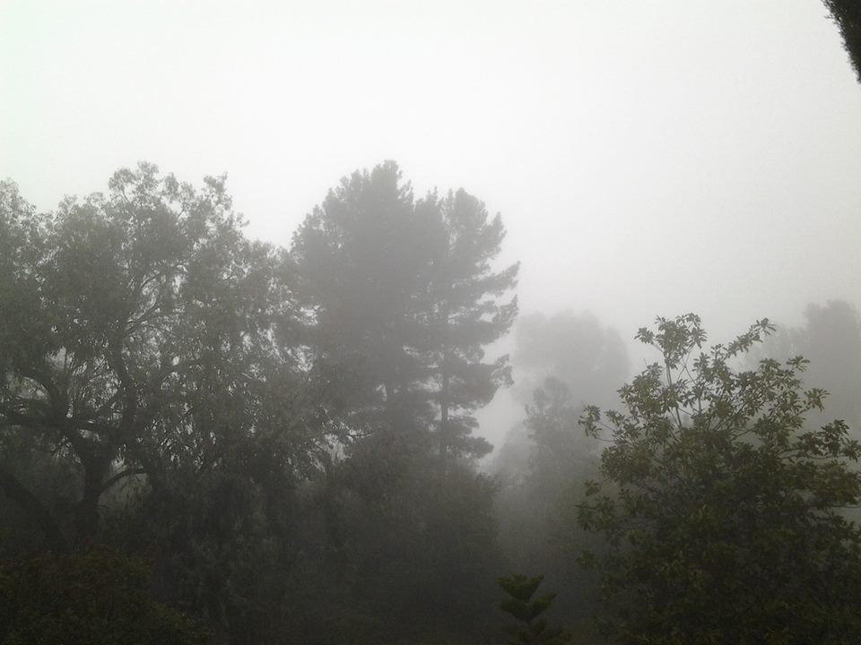 今朝起きたら、ものくろの墨絵の世界でした。 我が家は海に近いので、砂漠の暖かい風と海の冷たい風がミックスして霧が出ることが多いのですが、昨夜はベティーの家からの帰り道、数メートル先は見えない濃さ。その中を運転するのは肩がこりますね。