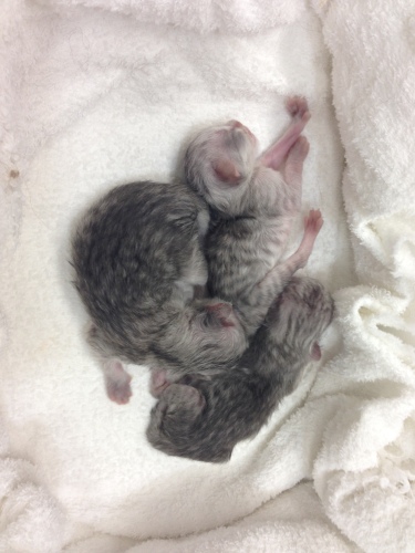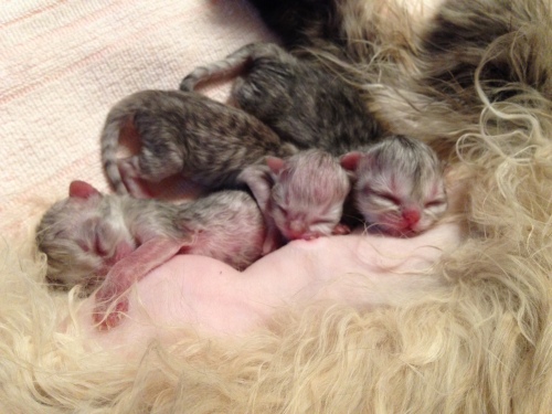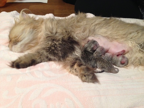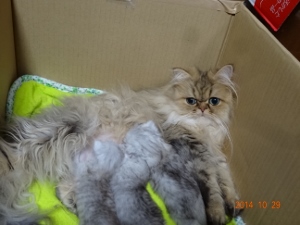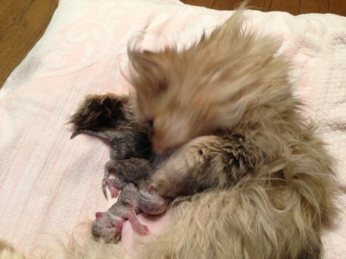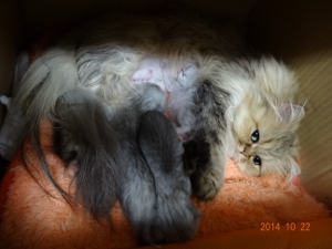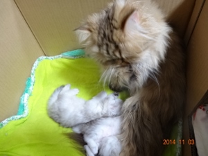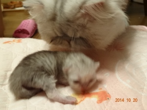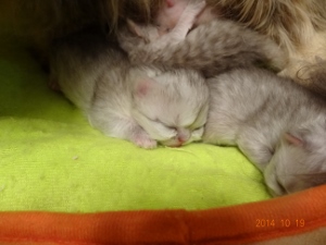2014年10月10日夜11時頃、ゆかりの‘C’Litterが生まれました。夜中にお迎えに行って、クロおじさんもお仕事帰りに合流3匹とも無事でした。そしてミンニャ…シルバー。今回の赤ニャンは、最初の麿ちゃん、2番目のはなちゃんと比べ、最初から安心してみていられるぐらい元気だったそうです。ゆかりお疲れ様左から時計反対回りに3号(大きい子)♀77g、4号(色の濃い子)♀58.4g、5号(白っぽい子)♂49.8g。クロおじさんったら、院長が説明しているそばからカシャカシャマ、今回の写真はみんなphoto by クロおじさんです。ただ、今回はタイミングが悪く、ゆかりがなかなか子育てモードに入りませんでした。初乳は飲ませたので…一応自覚はあるようですが、子猫を近づけても…フーッツ、シャーッツ…結局、朝の7時過ぎまで、子猫を放って独り、部屋の片隅でネンネ。仕方ないのでミルクを作って哺乳…でもさすがにそれは続かないので思い切ってゆかりを座布団に乗せて四肢をこちらでちょっと押さえて…子猫3匹をくっつける…最初は痛いので怒ってましたが…5号がしつこくおっぱいに吸い付いたので…だんだん母性が勝って、自分から授乳モードになりました。ゆかちゃん!頑張ったね。しっかりお母さんしてます右から3号、そのとなり(真ん中)4号、お顔が見えないのが5号左から5号、4号左から5号、4号、3号最後までおっぱいに吸い付いていた5号一番小さくて、一番食いしん坊で、唯一の男の子食いしん坊なのはさとみ君に似たようです最後までお読みくださり有難うございました。そしていつもご訪問と応援をありがとうございます。にほんブログ村にほんブログ村にほんブログ村にほんブログ村↑ランキング参加中で~す❤ポチしてニャンPetCブログランキング