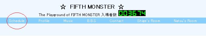 先日後悔・・・、もといw公開されたw、 FIFTH MONSTERのライブ映像が見られない!と 聞きます。すみません~~~!!!。 以下に現在の手順を表示しますね。 まず FIFTH MONSTER バンド公式HP を開いて ↓ 水色のラインにあるメニューに『Schedule』があるんでクリック ↓ トップに『> 』という画面がでるんで 下にスクロールすると ↓ 『』があります。ここの『2006年 ライブ』の 『● 2006.04.16(Sun) 東京MXTV「BREAK音」収録ライブ L@N Akasaka』をクリックすると ライブレポートが表示されます。ここを下にスクロールすると、 ↓ 下のようなメニューがあるんで『SKY ROCKET』か『さくら』を クリックすると動画が再生されます。 動画はこちらからどうぞ。 → Skyrocket → さくら ではではよろしこ!!! バンド関連URL FIFTH MONSTER紅一点! Vo Natsuのブログ FIFTH MONSTER バンド公式HP