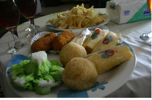 おやつ食べてますか~?バリ島でも皆さんおやつ大好きなんですね。お宅やお店にお邪魔したりすると、お茶請けにおやつが出される事があります。それは自家製のクルプックだったり、果物だったり、きょうはイスラムの方のお宅で頂いたおやつをご紹介しましょう。ビックリしたのは、おやつというよりおかずです。一番奥をに在るのは、なんとコロッケなんですよ!コロッケをおやつにしたのは学生時代以来、肉屋でコロッケを経木で挟んでもらって、ソースをかけて歩きながら食べたっけ、そんなコロッケです。それとゴマ団子。これは中国のスイーツになりますよね。左に写っているのが蒸しパンのようなもの。そして薄焼き卵で包んだオムレツ風なもの。これがおやつなんですって。デンパサールのショッピングモールなどにも、この辺のおやつが売られています。バリの若い男の子でもケーキが大好きと言うくらいおやつ好きなので、この多国籍チャンプルおやつも、ケーキの仲間入りなんでしょうね♪バリがだ~い好きな人はココ押してくださいね♪バリがいつまでもステキな島でありますように