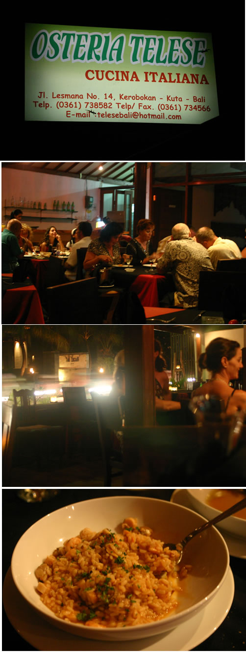 バリ島にイタリアンレストランは山ほどあり、いつでも何処でもお客さんで混んでいる。イタリア人はイタリアンしか食べないの?っていうほど、自国の料理を愛する気持ちや執着心が強く、毎日の様にイタリアンレストランに足を運ばせるのだろう。ウブドに住むイタリア貴族の末裔が、幼いバリ人を雇い、イタリア料理を仕込み、一端のシェフに育て上げ,毎日の食事を作らせているという話を聞いたことがある。オベロイ通りの五つ星ホテル・ザ・レギャンのまん前にこのレストランがある。確か昔、ここの場所は、家具屋の工房があったはずだ。時代の流れでいまではレストンに建て替えられている。店内はバリでは良くある、通りに面してオープンになっている造りで、時折通る外の車のライトが気にはなるが、それでも落ち着いた雰囲気が楽しめるのは、そこそこドレスアップをしているイタリア人のお客がインテリアになってくれているからだ。赤ワインとおつまみと【一時間かかるので、事前にご注文ください】と書かれたシーフード・リゾットを注文する。陽気なイタリア語の飛び交う空間で、バリに居る事を一瞬忘れてしまう。赤ワインのグラス越しに、透かした車のライトが真紅に輝いている。バリがだ~い好きな人はココ押してくださいね♪バリがいつまでもステキな島でありますように