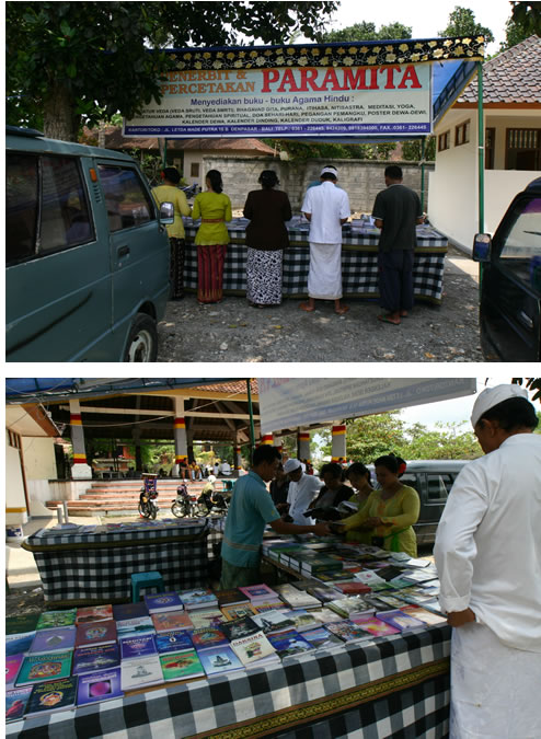 プラ・プティトゥングッのお寺のお祭りに遭遇して、境内の外をぶらぶら歩いていると、テント張りの本屋さんがありました。お寺のお祭りを周って店開きをして、バリヒンドゥー教徒の皆さんに本を売っているのでしょう。販売しているのは、総てが宗教色豊かな本ばかり。表紙を見ていると、ヒンドゥーとバリヒンドゥの両方があるように思えます。お客さんも手に取った本を無心に立ち読みしている姿が印象的でした。ボクもパラパラとめくって見てみたんですが、ちょっと太刀打ちできそうもないので、絵を観るだけに留まりました。神様と真向かいで接する事の出来るお祭りの場での本屋さん。絶妙なタイミングだとおもいませんか?バリがだ~い好きな人はココ押してくださいね♪バリがいつまでもステキな島でありますように