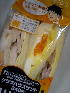 美味しいパンを求めてパン屋まで行く途中、暖を求めてファミマへ。(最近はすっかり寒くなったよね)ふらふらしている私の目に飛びこんだもの、それは千秋様専用(?)裏軒のクラブハウスサンド!こんな催しらしい。他に裏軒メニューの麻婆煮込み野菜丼、千秋先輩の呪文料理、蟹と海老のクリームスープパスタがあるようです。のだめ、音楽まんが(&ドラマ&アニメ)ですが、さりげなく色々なお料理&料理人?が出てきますよね。とりあえず今はターニャの手料理が食べたい(家庭の味☆)パリ編のピザ屋さんもおいしそう~♪クイニーアマンも食べたい。・・・のだめカレーだけは一生パス!とりあえず次は呪文料理にチャレンジ、です♪※あ、ちなみに味は普通。暖めるといい匂いで、具がリッチなのでそれなりですが、もうちょっとパンがカリッと焼いてあるサンドウィッチかちゃんと押さえてパンがつぶれている(?)ようなものの方が好みです。(つまりコンビニサンドウィッチはあまり好きでない)
