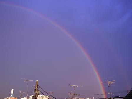 昨日の夕方はお休みのパンダ君と部屋におこもり私はDSパンダ君は窓際でパソコン窓際のパンダ君「あ、夕焼けになってきたなぁ・・・」私「・・・そう・・・カチャカチャ(DS操作の音)」パンダ君「雨上がりだから、また虹が出たりしてね~」私「かもね~・・・カチャカチャ・あ、ちっやられた・・・」パンダ君「ほら~~~~出てるよ~~~」私DSを投げ出す「ひゃぁ~~~~~すご~~~い」早速ベランダへ出て撮影きれいな半円形の虹が出てるのよ~~~しかも2重になってる~~~アップでは赤・橙・黄・緑・青・藍・紫~♪屈折し~そう~~(硝子のプリズム)ちゃんと7色見えたよかなり長い時間見えてたけど夕焼けも輝き出してすごくきれいな瞬間でした