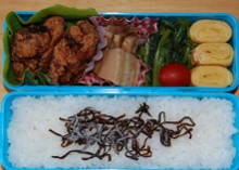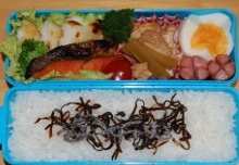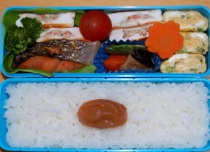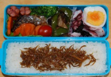 今日は湿気が多くて蒸し暑いですじっとりと汗ばむ感じ・・・傘を握る手が汗でべとべとになりました薄手の長袖シャツで出勤したのですが半袖にしなかったことを激しく後悔しました。(まだ衣装ケースの中ですが・・・)ついでに言えば、靴下&靴では蒸れるので素足&ミュールにするべきでした4月が肌寒かったので油断していましたが名古屋の5月は暑いんだった・・・突然夏陽気になり、着るものがありません。やっと引っ越しの片付けが一段落したのに大慌てで衣替えしなくちゃですいやいや・・・まずはファンヒーターを片付けないと^^; 焼き鮭、ウインナー、サンチュ、ブロッコリー、人参、茄子とピーマンの甘辛味噌炒め、タコとワカメの酢の物、ゆで玉子、イカナゴのくぎ煮