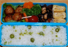ダーも私も豆ごはんが大好きですが、これまでは豆をご飯と一緒に炊き込んでいて豆にシワが寄ったり、色が悪くなったりして納得のいく豆ごはんが作れませんでしたそこで、今回は、以前テレビ番組で紹介されていた豆を炊かない作り方を真似て作ってみました<豆ごはんの作り方>1. 水洗いした豆を、少量の塩を入れた熱湯で茹でる。2. 茹で上がったら茹で汁に入れたまま冷ます。 (すぐに取り出すと急激な温度変化で豆の表面にシワが寄る)3. 茹で汁が冷めたら、洗ったお米にその茹で汁を加え 茹で汁でお米を炊く。(豆は入れない)4. 豆の半量を包丁でみじん切りにする。5. 炊き上がったご飯に、みじん切りにした豆と そのままの豆の両方を加えて混ぜ合わせ 炊飯器の中で10分ほど蒸らして出来上がり豆の茹で汁を使ってお米を炊いたり豆の半量をみじん切りにして加えることで豆の香りがご飯にしみ込みますシワのないツヤツヤの豆ごはんができましたとても美味しかったので豆ご飯好きな方はぜひお試しください 鶏つくね、サンチュ、ブロッコリー、人参、ミニトマト、ひじきの煮物、玉子焼き、豆ごはん