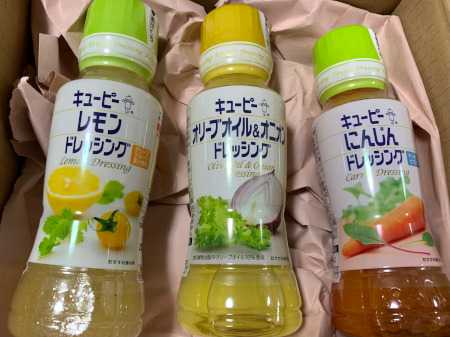 モラタメさんの『モラえる』でいただきました『キユーピードレッシング 3本』どれも使ったことのないドレッシングですがネーミングからしてさっぱりとした印象。ダーは絶対に好きだと思いました。もうだいぶ前に作りましたが…うちのベランダで収穫した水菜とサラダチキンのサラダ。レモンドレッシングがとてもよく合いましたあと、レモンドレッシングで和えたセロリをタコのお刺身に添えてみたのですがダーは、タコをスルーしてセロリが美味しいと絶賛^^;「どうやって味付けしたの?」と聞かれ本当はもっと手間がかかっているように言いたかったのですが「ドレッシングで和えて黒コショウをゴリゴリしただけ…」と、不本意ながら(笑)正直に答えました。レモン酢にレモン果汁とグレープフルーツ果汁を合わせた爽やかなドレッシングで、野菜の美味しさを引き立ててくれます『オリーブオイル&オニオンドレッシング』はエキストラバージンオリーブオイルと玉ねぎの風味をいかしほどよい酸味に仕上げられているようなのでカルパッチョにも良さそうです『にんじんドレッシング』はグリーンサラダに足りない彩りも加えてくれそうでシンプルなサラダでいただくのが楽しみです