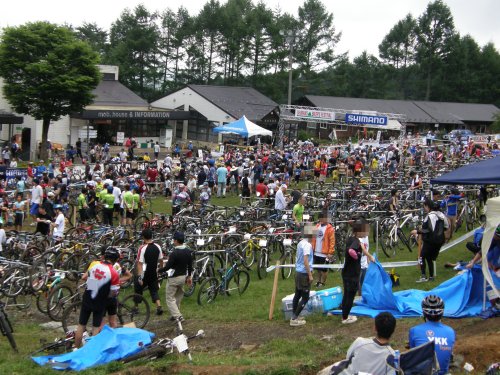 週末は毎夏恒例のシマノバイカーズフェスティバルに行ってきました。いつもは10人以上の大人数になるのですが今回は都合が合わず部長、Hさん、おいらの3名での参加。シマノバイカーズの目玉的レース「4時間エンデューロ」のMTB3人組みを走ります。移動は当日、深夜に地元を出発して現地到着は朝4時半。少し仮眠を取って会場へ!バタバタと受付を済ませ交代エリアに休憩ポイントを設営していると・・・ポツポツと雨が。5月のabcカップ以降、王滝、AL千葉と雨レースに祟られているおいら、心配は的中です。泥んこレースもたまには面白いのですけどね~ 毎回となると自分の雨男ぶりを疑います^^;そんな雨模様の中MTBerがずらり! いつもながらこの光景はすごいですね~^^各チームカラフルなジャージに身を包みスタートを待っています。(2周目からはみんな茶色ですが)スタートはやはり部長から! 以降Hさんおいらと2周ずつ交代、3人で4時間を走ります。走り始めることには雨もやみ一安心。とはいえコースはまだまだマディ、転倒者続出でレースはなかなか混戦模様。 部長も2周走って1コケの泥だらけになって帰ってきました。次走者のHさんにいたっては2週ですでに数え切れないほどのコケをメイクしていました^^そしてついにおいらの周に! Hさんから計測チップが内臓されたバンドを受け取りいざ出撃!と勢い良く自転車に飛び乗ろうとしたところサドルに飛び膝蹴りをメイクしコースを走る前に転倒^^これはもう気をつけるとかそういう問題ではないですね。そしてズシっと痛む足を気にしながらコースを走り始めると・・・「ザー」・・・ 雨です。 おいらが走り始めた瞬間雨ですか・・・その後、おいらも木の根で前輪を滑らせコケて見事に茶色組みの仲間入りをして部長にタッチ。「お腹いっぱい~」と走り始める部長ですがいざ走り始めるとほぼ毎ラップごとにタイムを縮めてきます。そして今度こそ雨もやみ青空が見え始め暑さが気になってきました。そして迎えたおいらのラップ、今度こそ無事乗車を済ませコースに出ると・・・「ザー」・・・雨です。 おいらが走り始めた瞬間雨ですか・・・このシマノバイカーズではレースのリザルト速報を携帯のサイトで見ることができ、リアルタイムで自分のチームの順位を知ることができます。 レース前半では27~24位あたりに位置していたのですが中盤、渋滞も解消してくるころになると20・・・19位と徐々に順位をあげレース後半には18位まであげてきました。<激走中の部長>雨も止み最終ラップ、14分を残してHさんからおいらにタッチ!レースも終盤、カラダは疲れていますが何とか時間内に帰ってくればもう1周ラップを稼げるチャンスです!「がんばれ!」と励まされコースに飛び出たおいら! 2週目のことなど考えずにダッシュです!「ザー」・・・雨です。 おいらが走り始めた瞬間雨ですか・・・18周中6周のおいらのラップだけ雨とはいったいどういうことでしょうか?最近どうも雨レースが多いナと思っていましたがどうやら雨男は・・・「おいら?」とはいえ頑張った甲斐あり時間内にラインを踏んでラップを重ね感動のゴール!2年連続でおいらがゴールさせていただきました^^結果は1人抜いて17位。去年より順位は落としてしまいましたがみんな良く頑張り満足な結果です!そして見えたおいらの今後の目標は「雨の日のライディング強化」です^^;ちなみに今回宿泊地の入笠山にあるキャンプサイト↓目前に森林、背後に湖のすてきなキャンプ場!しかも小学生団体が入っているからとのことで給仕場から離れたところで無料で貸切提供してもらいました!今回は時間がなかったのでゆっくりすることはできませんでしたがこんなところでゆっくりキャンプしてみたいですね~ちなみにテント設営、撤収以外の滞在はすべて雨。「これもきっとおいらのせいなのです。。。」↓バナークリックでMTBブログがいっぱい!↓テーマ【マウンテンバイク◆MTB】もよろしく→HIGH MOUNTAIN TOP→
