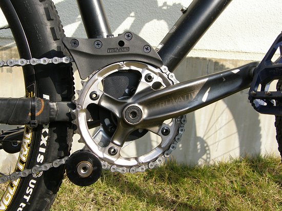 MONTYでは今までカセットスプロケットをロード用の13-25を使っていたのでチェーンリングはそのままミドルの32Tを使っていたのですがスプロケットをMTB用の物に戻すついでにチェーンリングを36Tに交換しました。フロントシングルでの使用ですがリングがアウターになるとやっぱガイドがないとチェーンが外れてしまいますのでチェーンガイドを取り付けました。セッティングもバッチリ決まって走り出すといい感じです!が、チェーンラインの関係かフェィキーでペダルを逆回転させるとスプロケ上でチェーンが外れてしまいます。フェィキーからの戻りのためにペダルを踏むもチェーンが噛まないのでうまく戻れない状態。リアが11Tにあるとうまく逆回転できますがさすがに3.2:1のギア比ではフェィキー~戻りは辛いです。また元に戻せば良いだけなのですがなんか悔しい。そこで思い出したのが・・・「スプロケットのロー側3枚の変わりにスペーサーみたいなものを入れてフェィキーではそこにチェーンが落ちてスペーサー上をチェーンが滑るのでクランクを逆回転させないでもフェィキーで走れるってパーツです。」これでBMXのようにフェィキーを走ることができるようになるのです。が、そのパーツの名前がわかりません^^;どこかの雑誌で見た記憶はあるのですが・・・誰か知っている方がいたら教えてください~!カテゴリー別メンテナンス記録 自転車紹介 インプレッション 走行記録 壊し物 未分類 ぜんぶ↓クリックでMTBブログがいっぱい!↓→ HIGH MOUNTAIN TOP →