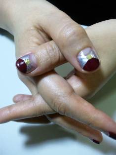 あんまり見えませんが(笑)ボルドーの逆フレンチにシルバーホロラインを4本の指にしてあります。親指はシルバーホロでリボンを、中央はゴールドでアクセント。サンプルはボルドーに黒のリボンだったんですがちょっとシックすぎちゃうかなぁと悩んでいると☆kingyo★さんにリボンをシルバーにするのは?と薦めていただいてこのデザインに。う~ん、なんて可愛い(爆)一応「オトナ可愛い」ってことで(笑)ボルドーは低下する一方な「オンナ度UP」に役立ちます(爆)リボンはどんなに年をとっても・・・大好きです!リボンはどの指にしようか悩んだんですが、バイヤーFBは爪が小さい上にふにゃっと柔らかくてあまり長く伸ばせません。なので素敵なデザインを爪に目一杯していただくことがなかなか(^^;つか爪の面積狭いので毎回申し訳ないですわ。せっかくのリボンですもの一番大きくていつも最後まで保つ親指に!もう、超お気に入りです。しかし、まぁ、こんな素敵な爪で行くところが会社しかない現実にクラッ(@@)