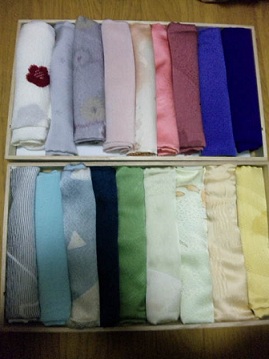 着物がダイスキ♪なんだけど・・・どうもなかなか着て外へ行けない・・・あ~練習しなきゃ多分・・・忘れてる(爆)そもそも・・・出来てない(爆)(爆)今日はぐちゃぐちゃになってしまっていた着物関連の収納をキレイにしてその後は着付けの練習をするはずだったのですが・・・精根尽き果てた(爆)収納はまぁきっちり出来て、ちゃんと入れると余裕もでるものでまぁなんとか。帯揚げ・・・桐の箱に入れてたんだけど、中に帯締めを入れるための仕切りがあってそんな狭いところには1~2本くらいしか入らないし・・・バキバキっ(爆)もぎ取りました・・・そしたらこんなにスッキリ入りました。もっと早くにもぎ取ればよかったなぁ~おほほ帯締め・・・CDケースに(笑)半透明なので横からも色はわかるし・・・とりあえずコレで(笑)帯留めはクリアケースにでも入れてキレイに飾りたいんだけどな~そんな場所はないのでジップ小袋に入れて、これは懐かしのMDケースです。草履は必ず外箱に写真を、何入ってるかわかんなくなりますからね~着付けの練習は明日から~