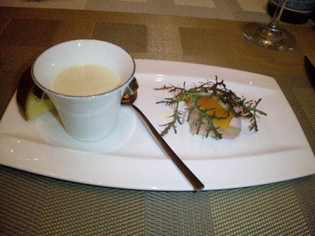 元旦の夕食が洋食ってのも初体験です。アミューズ2種パンと珍しくお酒は飲まず(笑)ガス入りミネラルウォータースモークサーモンとホタテのタルタル 野菜のテリーヌオマール海老とラビオリ クリュスタッセのカプチーノ長崎産のスジアラのポトフ仕立て鳩のパイ包み焼デザートブッフェ元旦から食いすぎ(爆)