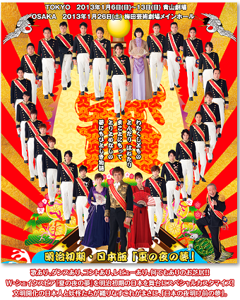 http://dorijyan.com/1/11の夜中に書いていたらとんだここでとりあえずキープ・・・今年のSHOCKは昨年までの登場人物がかなり変更される。支配人、オーナー役の植草さんもその一人。このお芝居の発表があった時から「多分代わるな」とは思っていたけど。酔っぱらう演技は必要ならして下さい、ですが、(あそこまで延々する意味は不明でしたが)客席に向かってゲロを吐くような演技は本当にイヤでした。妙な被り物しての登場も子ども向きの舞台でもあるまいし・・・不愉快でした。ソロパート持つほどタップダンスもうまくないし・・・だったら他の人にチャンス与えるべきだし。リカちゃんソロの方がよかったな。まぁ、これは彼の責任ではないとは思いますが、オーナー役がそこそこ大人の人になると「じゃぁ、なぜ、あの事故を止められなかったの?」って大きな疑問が。大倉くんのような座長より年下のオーナーではオーナーであっても客を呼べる座長に意見しづらい、なのであの悲劇が・・・って話が成り立つけど、キャスティングありきで植草さんにしちゃうと脚本の弱点が如実に。思ってました、心底「早くオーナー役代わらないかなぁ。」と(爆)もう、周りが本当に持ち上げてあげていて、それを有難いと感じてくれていればいいんですがあくまで一番大変で苦労してるのは座長だし、それわかってたのかなと。もう、先輩に気を使ってあれだけの舞台務めて本当に大変そうだなってこちらは思ってしまいましたけどね。私もあんな立場やだもん(爆)しかし、まぁ、代わるとなると「彼はあれだけ恵まれてるSHOCKの舞台以外ではどんな態度なんだろう」と興味が・・・極Sですな(笑)なので久々妹を誘って観て来ました。お客様の入りは超満員とは言えず・・・ご招待も多かったよう。1階席は大体埋まってはいましたが、最後尾まで埋まってはいなかったですし2階席に人はいるのかな?って感じでした。今って「SHOCK」と「劇団☆新感線」くらいでしょうかね、動員見込める舞台って。いろいろな舞台を観ますが本当にどの劇場も寂しい限りで演じてる側もどう思ってるのかなぁと・・・今回の舞台は私はあんまり知らないですが、若手イケメン舞台俳優多く出てるらしくもう、お約束のところでの笑いとか、その方の以前の舞台のことでの笑いとか知らないとわかりませんけど・・・的なところも多かったですね。まぁ、しかし、明日の舞台界を支える若手演者、彼らを応援する若い観客、ええ、もう、温かく見守りますよ。それと、こちらの舞台はシェイクスピアの「真夏の夜の夢」のあらすじは知ってないとちょっとわかりづらいです。知ってなくても楽しめますってよくあるけど(笑)知らないと理解できないのは残念だし。まぁ舞台好きなら知ってて当たり前だよねって・・・なんて高尚な(笑)本を全然読まない妹は?でした(笑)久野綾希子さんや紫吹淳さん、左とん平さん。個性が確立していてセリフがちゃんと聞こえて(笑)やはりねぇ・・・違うのよねぇ・・・左さんが実は妖精パック役の座敷わらし(笑)実にひょうひょうとした味のある役で・・・特によかった。鳥居みゆきさんはそのまんまだった(笑)ブレがない(笑)若手たちはまだまだこれからだと思うけど熱意が感じられるし多分こんな大きな劇場はあまり経験ない?人が多かったのかなとは思うけど勢いやパワーは感じました。これから経験積んで頑張って欲しい。なかなかイケメンさん(笑)スタイルいい人などもいてこれから楽しみですね。だけどもお話はちょっとバタバタしすぎててもうちょっと整理できないか?と思うしそうそう、おまけに幕末のことも知ってないとわからないことも多いさらに高尚な舞台なのねん。植草さんはまさに特別出演みたいな感じで、いいポジションでしたね(笑)外部でも大事にされてますね~。イマイチわからない点も多く、少々退屈で疲れも出て人生でこんなに寝たのは初めてってくらいでしたが(爆)それで辛口批評すんなって感じですが(爆)(爆)時折かっくんって感じですから!本編の後にレビューがあるんですが・・・衣装がみんなあずき色のジャージなんです(笑)で、歌って踊るんですが・・・鳥居みゆきさんと若手男子が女装して!?ももクロの歌。これはもう世界が構築されてるので面白く・・・また、ここで本物のももクロみたいに色とりどりのペンライト振ってねってお約束になっていたみたいで彼らのファンであろう方々が振ってましたね。紫吹さんはレディーガガ、さすがの貫禄でした。ジャージでもかっこいい(笑)植草さんは・・・もちろんの少年隊「君だけに」もともとご自分のパートじゃない?のかそれはお上手ではなかったですが(笑)それももちろんセンターで若手男子従えて・・・やはり恵まれている(笑)しかし、これだけスタイルのいい若手が多いと植草さんが顔が大きくてお腹ぽってりのおじさん体型がとっても目立ってしまいました・・・同じジャージ着てるから特に目立つのよね~もうちょっと絞るといい