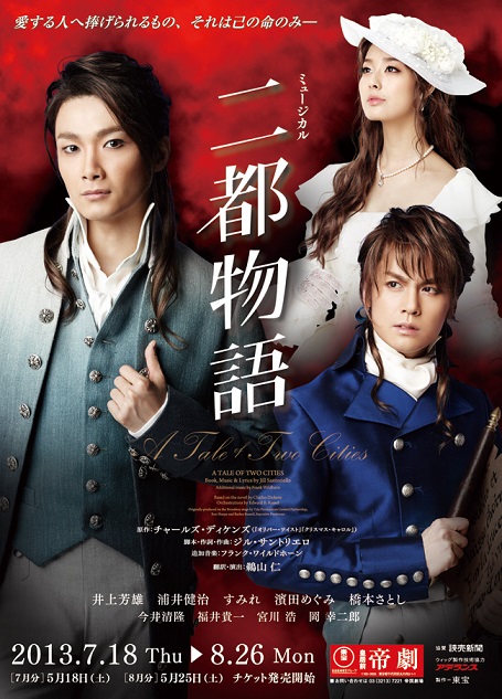 http://www.tohostage.com/nito/この日は浦井健治さんのお誕生日私はやっぱり井上さんより浦井さんが好きなのだわカーテンコールで出てきた浦井さんに井上さんが「HAPPY BIRTHDAY」のキラキラ飾り首にかけてあげました。裏返って白で地味でした・・・(笑)気が付いて直しましたが。にっこり笑ってジャンプする浦井さんは・・・チャールズじゃなくてシャルルだった(笑)光一さんとはまた違った王子様♪まぁ、全体に言えるのはやはり安心東宝クオリティー(笑)最近観てなかったので、余計感じますね。ただ一つ「すみれ」ちゃん。良くも悪くも(笑)風穴開けてくれます(笑)良くは・・・そりゃとっても美しい、顔は小さく手足は長く、はっきりしたお顔は華やか。思ってたよりずっと歌もいい。悪くは・・・ちょっと不安定話し方が・・・日本語あやしい感が(笑)でも、今までにないタイプ、今後にすごく期待しますね。東宝育ち、宝塚育ち、四季育ち、それ以外ってなかなか・・・出てこないですものね~次はミュージカル『エニシング・ゴーズ』にも出ます。さて、本編こんな哀しい結末が待っているとは・・・・チャールズの身代わりになったけど、最後ギリギリで助かると思ってた(爆)そして、チャールズとルーシーの娘ちいさなルーシーが育って結婚すると思ってた(爆)どんだけハッピーエンド主義なんだ私は・・・愛した人は友の妻、信頼と友情は勝ち得たけれど愛だけは・・・生きてる限り手に入らない、友とその妻と自分を本当に信頼してなつくその子どもの為に・・・だけどこんな哀しい最後・・・なんて。なんでチャールズはパリになんて戻ったんだ~君が戻っても召使は助からなかったじゃないか~あーもーと思うお話でした。斬首刑を待つ間、貴族のお針子だったというだけで罪もないのに殺される女性がシドニーに「その時まで手を握っていて頂けますか?」フランス革命の断頭台、最後はロベスピエールでさえその下に・・・凄まじい時代だったんですね・・・パリとロンドン、2つの都で繰り広げられる、愛と友情と忠誠の物語。お薦め、是非観て下さい。