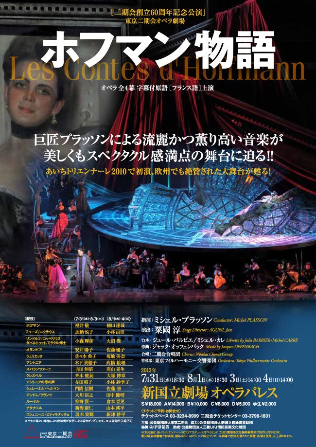 これは面白いお話でした。主人公ホフマンが、歌う人形のオランピア、ヴェネツィアの娼婦ジュリエッタ、瀕死の歌姫アントーニアとの恋を、今の恋人のオペラ公演の間に酒場で語るという物語。歌う人形のオランピアはコッペリウスが作ったもの。あれ?コッペリウスってバレエの「コッペリア」に出てきますね?何か関係あるのかな?オランピア、まー高い声ですごいですね。その上バレエのコッペリアばりのロボット!?ダンス。大変な役です。ただ、恰好が「椿 鬼奴」さんをほうふつさせました・・・(笑)ホフマンは人形とも知らず恋におち・・・ああ、哀れ・・・でも!ベネツィアへ行ってソク、高級娼婦のジュリエッタに恋しちゃう。変わり身が早すぎる・・・そして、騙されて・・・あーあ。ジュリエッタのドレスは日本の着物や帯から作ったものだそう。素敵でした。このオペラ、なかなか舞台セットがおしゃれ、斬新、スタイリッシュ。特にベネツィアの町、浮かぶゴンドラはクリスタル・・・キレイでした~(ポスターがベネツィアの場面ですね)で、今度は大きな声で歌うと体に障るくらい病弱なアントニア。ホフマンは歌の道はあきらめて自分の妻にと願うけど彼女の父はそれには反対。歌の道を諦めようとするけれど、同じく歌い手だった母の亡霊と激しく歌い息絶えてしまう・・・実らないホフマンの恋。でも、今はまた別のオペラ歌手と・・・(まぁ次から次へとおモテになること・・・)だけどどうも彼女もお金や権力のある人に取られそうな感じ?でも、ずっと一緒にいた友人が実は「ミューズ」でそれに励まされ創作活動に・・・って感じに私には見えました。こちらは二期会の作品。でも、あんまり日本人臭さがなくて言われないと海外の人と思うかも。あ、でも、みんなスリムなので(笑)そこがにすごいかも。まぁ、珍しく日本語のセリフがあるので、オペラというかミュージカル的な感じも。そして、なんで二期会なんだろ~一期会はどこに???と思っていたら『「二期会」とは、それまでの先人たちのオペラ活動を第1期であるとみなし、自らが第2期の中心となろうとの気概を込めた命名であるという。』だそうです。