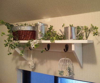 ウォールラックを取り付けました。作ったのと言いたいけど・・・まだムリ(笑)これのホワイトです。*クララベル*kiki ウォールラック☆可愛いkikiシリーズ、仏ブルゴーニュをイメージした杉材・桐...価格:3,570円(税込、送料別)これは階段上がってすぐのところの小窓の上。後1つはチェストの上につけようと思ってます。これは軽いものしか載せないからテキトーにつけたけど(爆)チェストの上はしっかりつけないと(^^;ブリキ&かごは前からあるもので、グリーンとブリキのバケツとジョーロはSeria(笑)とりかごはこれ。シンプルなワイヤーで作られた鳥かごのオブジェ。アンティーク風でシャビーな鳥かごをインテリ...価格:1,680円(税込、送料別)ローズのオブジェはこれ。フランス/フレンチ雑貨 Mathilde M 【20%オフSALE】マチルドエム 香りのオブジェ 薔薇 /ハン...価格:504円(税込、送料別)新築の内は釘打つのためらわれたんですが(笑)壁紙もそこそこ傷んできたし(爆)もういいかなって。まだ片付かないんですが、この小窓の下にはコンソールテーブルか奥行浅いチェストを置く予定。こんなのいいな~可愛い♪*クララベル*コンソールテーブルハーフ『 ショコラ 』チョコレートケーキをイメージして作った...価格:13,860円(税込、送料込)更にこんな感じ載せすぎか(笑)