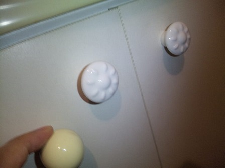 こないだSeriaへ行った時(・・・またかい)ついクセでまた取っ手のコーナーを見てしまったら(笑)やっぱり私が10個やっとコンプリートしたタイプのベージュはなかった・・・本当に「聖夜の奇跡」の最後の1個だったんだなぁ・・・サンタさんありがとう・・・(爆)で(笑)そこで陶器の白い可愛い取っ手が2つだけあったので・・・買っておいたの。ほら、2つあれば今後またいろいろ使えるしと思って。見つけました!使うところ♪取っ手が時々くるくる回るなぁと思ってたら、ネジでとめてあることに気付いたの。洗面所の下の扉です。手に持ってるのが元の取っ手で、プラスティックみたい。よく見ると安っぽい(笑)Seriaのはもちろん100円だけど陶器で結構しっかりしています。今、2階の洗面所もいろいろ変えてる最中なのですが、扉のところはどうしようか思案中でした。取っ手代えただけでもやっぱり雰囲気変わるものですね~おまけについてたネジでちゃんととまって助かりました♪なんか嬉しい(笑)