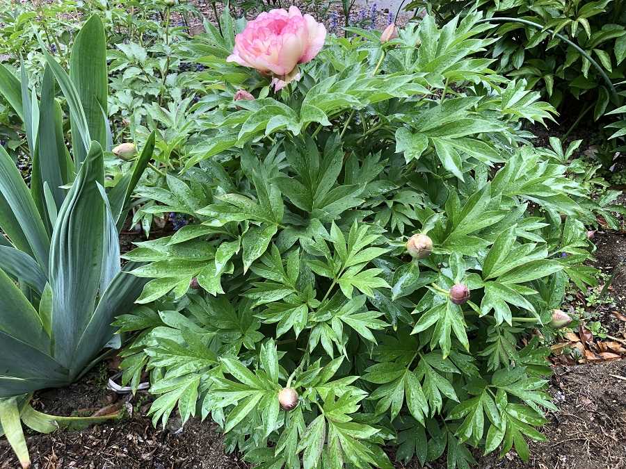 このハイブリッドシャクヤクを植えたのは2017年の秋ですが、昨年、移植して場所をかえました。その時、たくさんの肥料をあげたせいか今年の成長はよかったようです。