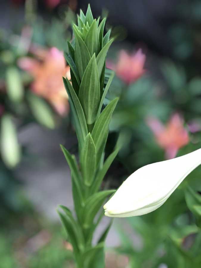 テッポウユリのウォッチアップです。これは大きな球根の時は非常に背の高くなるユリでしたが、小さく分球したものはお手頃なサイズで咲いてくれました。咲く時期も球根の大きなものはもっと遅いんですけれどね。このユリは少し特徴的な葉っぱのつき方なので判別可能です。