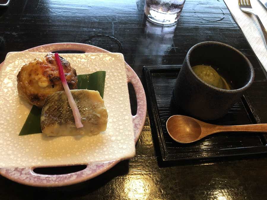 さて、夕食です。普通、事前に苦手な食材とか連絡しておくのですが、今回、苦手な「鶏のたたき」のことを忘れていたのでチェックインするときに、もし「鶏のたたき」があったら変えてもらえないでしょうか?とお願いしたのですが、運よく(運悪く?)「鶏のたたき」があったのでヒラメのお刺身に変更していただきました。そういう急なお願いにも応じていただけたことにも感謝しました。