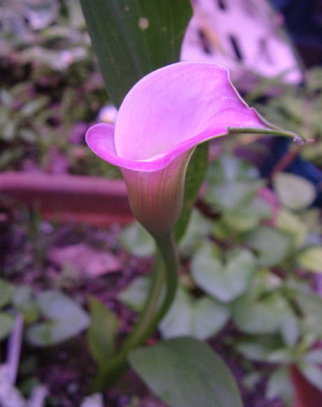 花言葉は、「乙女のしとやかさ、 すばらしい美、夢のように美しい」です。大学で腰を壊して、教師にならずにOLになりましたが、その職場には花当番というのがありました。花を買って生けて、1週間もたせないといけないのです。菊は仏前みたいだし、カーネーションも平凡で、花屋さんがカラーなら持ちがいいよと教えてくれました。本当に、1週間以上持ってくれます。切花でそうなのですから、我が家の鉢植えのカラーは、1ヶ月近くもってますね。色が濃くなってきたような感じだけど、一輪しか咲きそうにないので、頑張ってほしいです。おやこ劇場の運営委員を1年半やって、辞めるとき、ブロック会で花束の代わりに、カラーの鉢植えをもらったのです。球根だから、毎年咲いてくれて嬉しいです。
