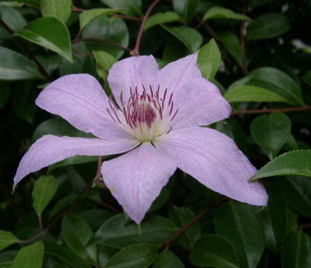 クレマチスの花言葉は「 精神的な美しさ、旅人の喜び」 です。バラ(ブルームーン)に絡ませたかったのだけど、なぜか垣根の山茶花に絡まってしまいましたまあ、外からも見えるといいのだけど、そこまでは伸びませんでしたね