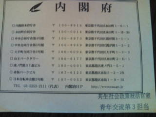 大学三年のマッキーから 「内閣府 東南アジア青年の船 日本参加青年に 受かったーっ〓〓〓〓〓 日本代表に選ばれた 〓〓 (^〇^)うれしーい〓〓〓〓〓」 というメールが来ました。 東南アジア青年の船の第二次選考に受かったのです。 埼玉県の第一次選考合格者は、県で研修を受け、 第二次に臨んだのですよね。 「おめでとう!頑張ってね」とメールを送ったら、 「10/22~12/17までだから 半期休学になるかも〓〓 とりあえず、 ゼミ教授に相談する!」 という返事。 以前同じような内閣府の船の参加者は、 テストをレポートにしてもらったりしたそうだから、 そんな風に考慮してもらえないかな。 英語や人物テストの面接を通っただけでも凄いけど、 日本代表として東南アジアを回ってきたら、 一皮剥けてくるかな?