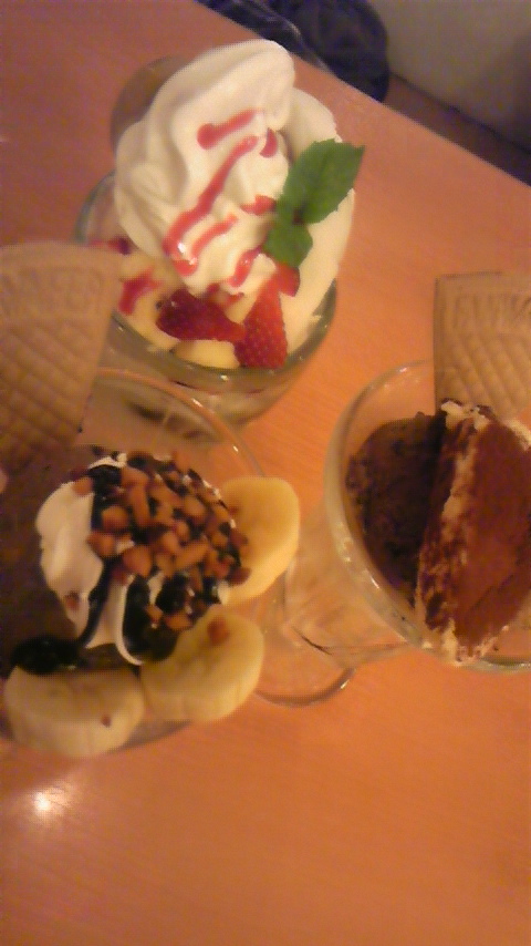 今日、勤務校の全校遠足でした。 疲れたので、早く帰って、 夕飯を食べていたら、 ミンミが急にパフェが食べたいと言い出したので、 不二家に食べに行くことにしました。 カズと私と三人です。 主人はまだ帰ってなかったのですが、 伝言メモを残し、出かけました。 私はティラミスパフェ、 ミンミはチョコパフェ、 カズは、ミルキーロールパフェを頼みました。 それぞれ味見しましたが、みんな美味しかった。 流石に最後は甘かったけどね。 ミントの葉で口直し。 主人にはお詫びにイチゴショートを買ってきました。 「誕生日ケーキは不二家のイチゴショート!」と指定するほど好きなのです。 私と4日違いなので、二人一緒の誕生日ケーキですが、 いつも主人の好みが優先なのですよね。 まあ、私はそれほどこだわらないからいいけど。 帰ったら、メモに気づかず、ちょっと不機嫌だったけど、 イチゴショートに免じて許してくれました。 買ってきて良かった。