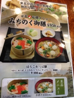 主人と映画「マンオブスティール」を観る前に、まるひろデパート入間店のファミリーレストランでランチ。私は、東北応援フェアのみちのく御膳にしました。主人は、はらこわっぱ膳で温かいお蕎麦のセット。みちのく御膳は、はらこわっぱ飯と芋煮、ずんだロール。主人が頼んだはらこわっぱ膳には、茶碗蒸しもついてきたので、少し分けてもらいました。昨日の一幸の茶碗蒸しの方が美味しかったかな。 はらこわっぱ飯は良かったけどね。 食べた後、まるひろデパートで、義母に敬老の日のプレゼントを買いました。 それはまた、別の日記に書きますね。