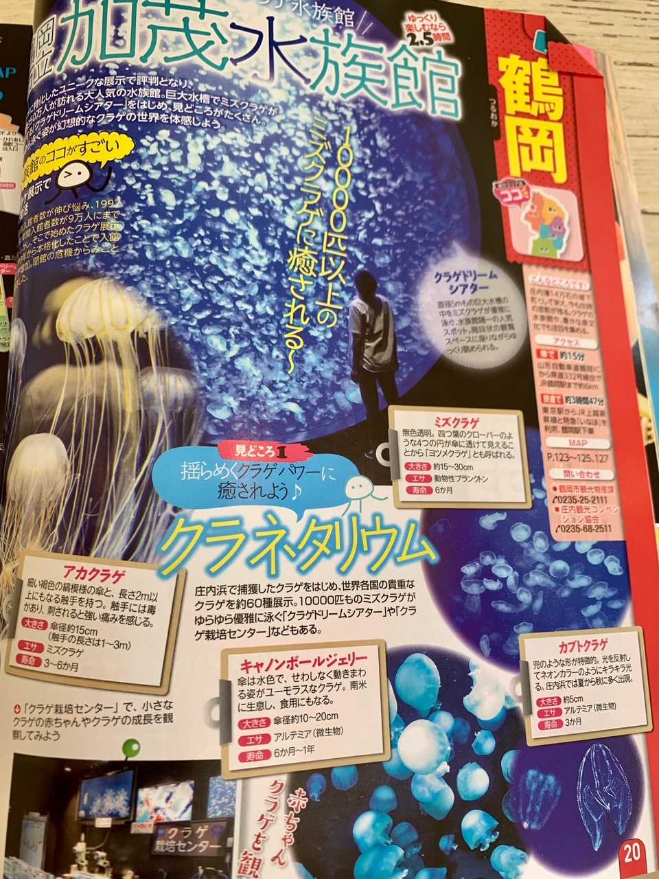 フルーツショップ青森屋の次は鶴岡市立加茂水族館へ行きます。くらげがいっぱい!入場券。市立だからリーズナブル!庄内の清流の流域別の展示。ナマズなど。姉妹都市江戸川区の金魚。庄内沿岸の魚。川から海へ。山形県魚はサクラマス。シロザケ。北方を回遊するサケ。ミズダコ。ガラスに吸い付いてビックリ!海底に咲く花。タコクラゲ。名前は名札を見て下さいね。クラゲの一生。エフィラ。最大のクラゲ・エチゼンクラゲ!クラゲドリームシアター。キタゾウアザラシのなおみ。なおみちゃんと呼んでた女の子!目の前の灯台。安良町公民館。夫が致道博物館に似せて新しく造ったものじゃないかと言うから、調べてみました。明治の同時期に造られたものでした。警察庁舎と分署だから、確かに似せてるかも😅
