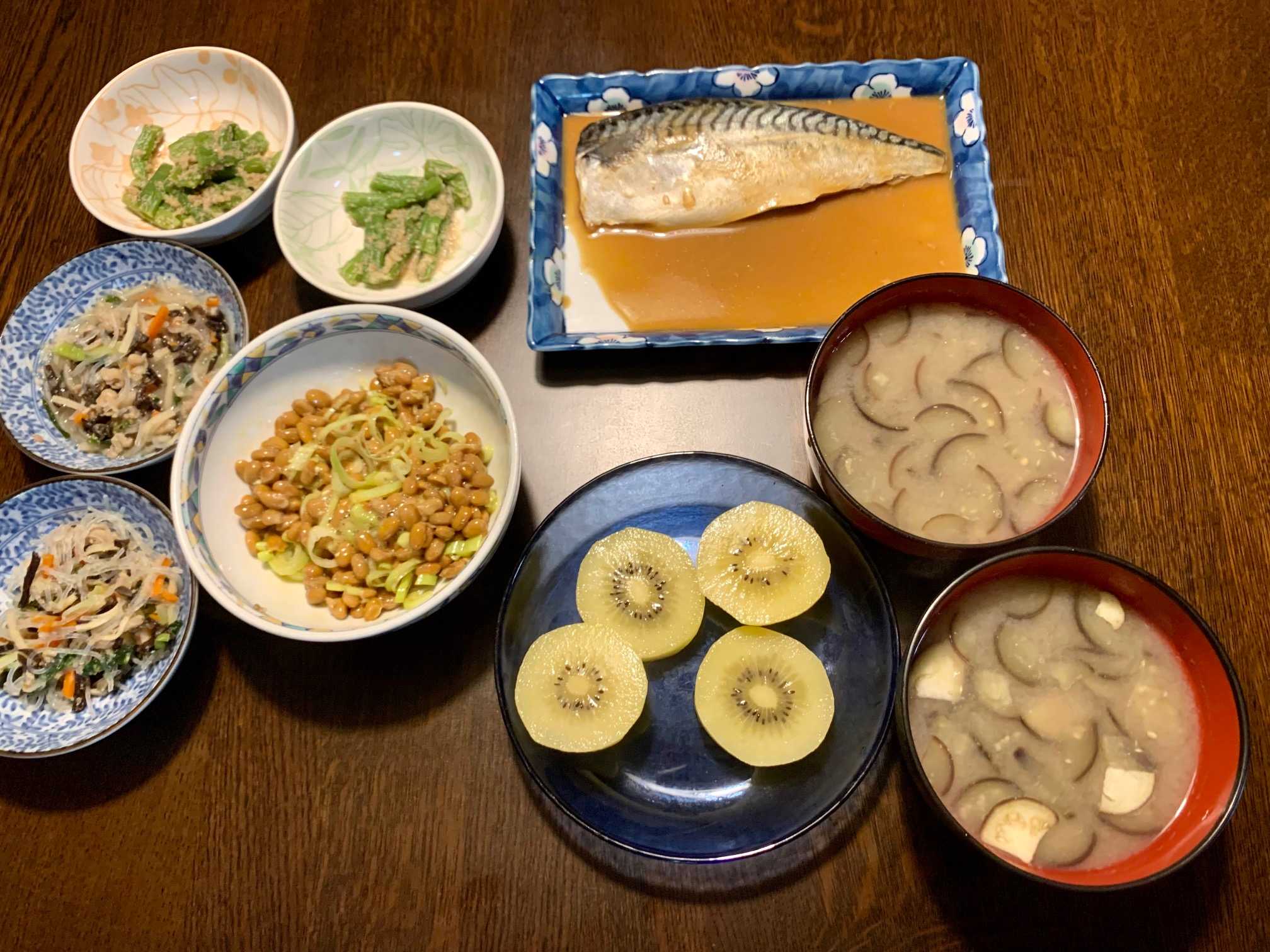 夕食は、鯖の味噌煮、納豆・ネギ、和風春雨サラダ、隠元の胡麻和え、茄子の味噌汁、ゴールドキウイ。体重は、夕食後・入浴前56.8kg。2日前より0.7kg減った!体脂肪率は、33.5%入浴後、56.7kg。体脂肪率は、32.3%。