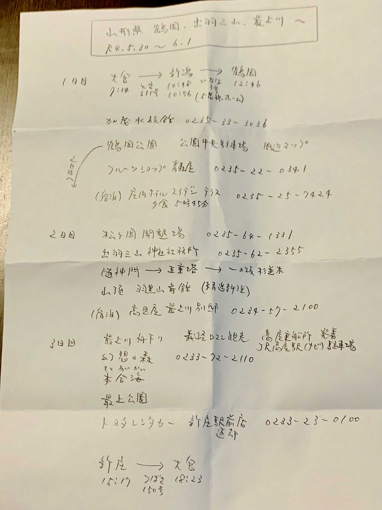 山形旅行の行程表。今日は、フルーツショップ青森屋、鶴岡市立加茂水族館、庄内ホテル・スイデンテラス。大宮から新潟まで上越新幹線。大宮でコーヒーだけ買い、駅弁は新潟で買おうと思った。上越新幹線の機内誌。新潟駅で乗り換え8分。乗り換え改札はすぐだが、駅弁売り場が無い、、、普通の改札へは混んでて間に合いそうにないので、自販機でポンジュースを買いました、、、特急いなほ3号には、チケットホルダーがあったので、入れてみた。何の為にあるのかな?と夫に言ったら、寝てても検札(チケットをチェック)してもらえるようにかな?と言っていた。今は検札しないようですが😅海近くまで水田がある。歌「雪の降る町を」発想の地つるおか。レンタカーを借りてから、フルーツショップ青森屋へ。ガイドブックに載ってたので行きたかったのです。昼食の駅弁を買い損ねたから、フルーツタルトでお昼代わり?😅メニュー。注文して支払ってから、カフェの席へ。夫は、いちごのベリーレアと、ラフランスジュース。私は、フルーツミックスと、瀬戸か?ジュース。三ヶ日みかんは終わってたので。次は鶴岡市立加茂水族館へ行きます。くらげがいっぱい!入場券。市立だからリーズナブル!庄内の清流の流域別の展示。ナマズなど。姉妹都市江戸川区の金魚。庄内沿岸の魚。川から海へ。山形県魚はサクラマス。シロザケ。北方を回遊するサケ。ミズダコ。ガラスに吸い付いてビックリ!海底に咲く花。タコクラゲ。名前は名札を見て下さいね。クラゲの一生。エフィラ。最大のクラゲ・エチゼンクラゲ!クラゲドリームシアター。キタゾウアザラシのなおみ。なおみちゃんと呼んでた女の子!目の前の灯台。安良町公民館。夫が致道博物館に似せて新しく造ったものじゃないかと言うから、調べてみました。明治の同時期に造られたものでした。警察庁舎と分署だから、確かに似せてるかも😅庄内ホテル・スイデンテラスに宿泊します。建築好きの息子も知ってましたね。設計は、世界的な建築家・坂茂氏。水田に浮かぶような木造建築。右は鑑賞用の稲が植え付けられてる。夫が撮影する時、指まで写ってしまった、、、夫。室内。女性には、化粧品をくれました。温泉棟には化粧品が無かった。スリッパ。持ち帰れる。割といいスリッパです。窓を開放すると、虫が、、、出羽三山の水。サービスかな。パンフレット。ライブラリー。レストランなど。鍵。2つあるから助かる。温泉・サウナ。今日は女湯が天色の湯。大浴場・サウナ・露天風呂が揃ってるから良かった。男湯は、残り2つで、出ないともう一つに入れないから、夫はサウナ・露天風呂の月白の湯だけにしたそう。案内図。解放的!渡り廊下。ライブラリー。温泉の休憩所。フィットネスジム。中庭。木の階段。サケ・バー。本物の水田も見える。サンセットテラス。夕食は、レストラン・ムーンテラス。夫は生ビール。セットメニュー。残雪の月山が見えました。隣は、系列の児童遊戯施設。私は、月山ワインのロゼ。前菜を撮り忘れてしまった!仕方なく、同じような前菜の写真を探して流用😅 自家製ベビーリーフは同じかな。バケット、バター。ガサエビのビスク。メインは、山形牛サーロインのロースト・船形マッシュルームソース。南瓜、マッシュドポテト、スナップエンドウ、ホワイトアスパラ。もう一つのメインは4種類から選べます。夫は、庄内ヒラメのヴァプール・白ワインソース。ブロッコリー、人参、じゃがいも。私は、庄内鴨のロースト・マルサラソースとりんごのモルタルダ。ブロッコリー、人参、じゃがいも。庄内いちごとホワイトチョコのタルト。コーヒー。ライブラリーの展示。渡り廊下もライトアップ。外へ出ると風が冷たい。カエルが大合唱。灯りが水面に映えてますね。芍薬、スターチス。照明。エコバッグ?