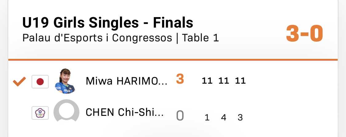 #WTT #ユースコンテンダー プラヤデアロ 【卓球 WTTユースコンテンダー プラッジャ・ダロ 2022:女子結果速報】試合予定・トーナメント表・アーカイブ動画情報ありWTTU15女子シングルス 高森愛央 準優勝!U19女子シングルス 張本美和 優勝!U17と二冠ですね!【U19-決勝】あっという間に終わってしまった。圧倒的な強さですね!このまま強くなってパリオリンピックに出て欲しい!・張本美和(13):WR7 3-0 CHEN Chi-Shiuan(16・台湾):WR- 【U19-準決勝】・面手凛(14):WR174 0-3 張本美和(13):WR7【U19-準々決勝】・面手凛(14):WR174 3-0 WANG Hsiao-Hsin(台湾):WR・CHU Yi-Ching(台湾):WR 0-3 張本美和(13):WR7・CHEN Chi-Shiuan(台湾):WR 3-1 小塩悠菜(13):WR 【U19-3回戦】・PAO Chi-Hua(17・台湾):WR160 2-3 面手凛(14):WR174・YEH Yi-Tian(14・台湾):WR91 0-3 張本美和(13):WR7・NG Wing Lam(18・香港):WR698 1-3 小塩悠菜(13):WR 22 【U19-2回戦】・Maria LOPEZ(17・スペイン):WR- 0-3 面手凛(14):WR174・Diya Parag CHITALE(19・インド):WR11 0-3 張本美和(13):WR7・Marta PENARANDO(18・スペイン):WR- 0-3 小塩悠菜(13):WR 22U15女子シングルス 高森愛央 準優勝!【U15-決勝】粘ったけど惜しかった。粒高に翻弄されてしまった。・高森愛央(14):WR233 2-3 PENG Yu-Han(14・台湾):WR216【U15-準決勝】・Bianca MEI ROSU(15・ルーマニア):WR21 0-3 高森愛央(14):WR233・青木咲智(15):WR142 1-3 PENG Yu-Han(14・台湾):WR216 【U15-準々決勝】・高森愛央(14):WR233 3-1 香取悠珠子(12):WR387・Cristina SINGEORZAN(15・ルーマニア):WR198 0-3 青木咲智(15):WR142 【U15-2回戦】・高森愛央(14):WR233 3-0 WU Jia-En(14・台湾):WR564・香取悠珠子(12):WR387 3-0 Alexia NODIN(11・フランス):WR447・Mariana SANTA(14・ポルトガル):WR99 0-3 青木咲智(15):WR142 【U15-1回戦】・Josephina NEUMANN(12・ドイツ):WR108 0-3 高森愛央(14):WR233・香取悠珠子(12):WR387 3-0 Joana PINTO(13・ポルトガル):WR750・Lilou MASSART(14・ベルギー):WR121 0-3 青木咲智(15):WR142