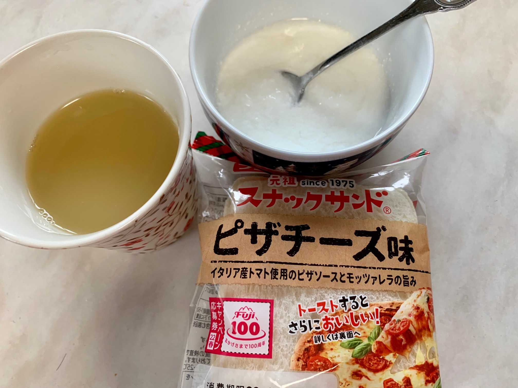 朝食は、スナックサンド・ピザチーズ味、カスピ海ヨーグルト、パインジュース。