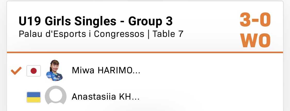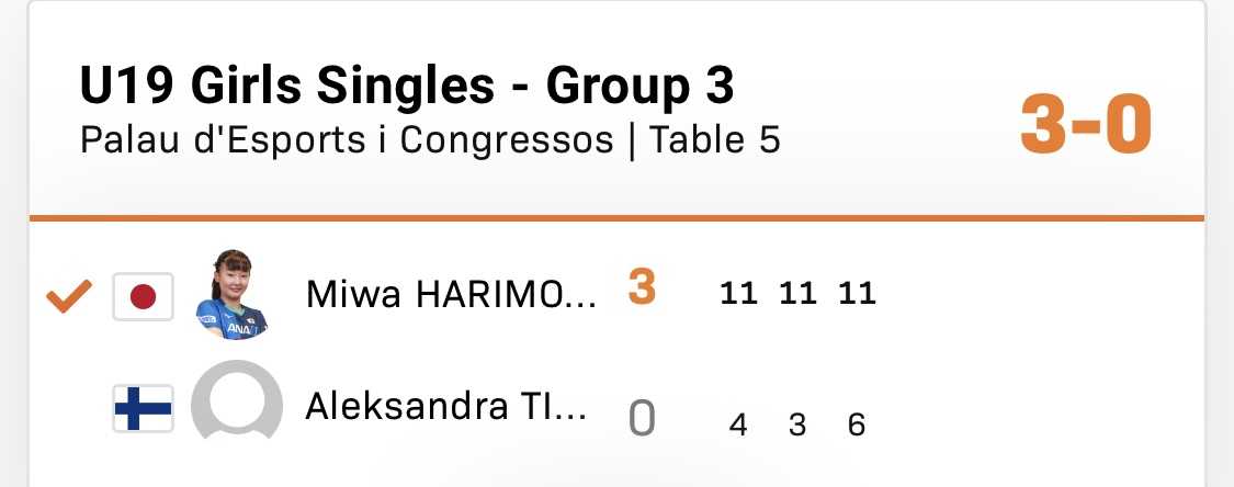 #WTT #ユースコンテンダー プラヤデアロ観戦。#張本美和 #小塩悠菜 面手凛 青木咲智 高森愛央 U17本選進出 香取悠珠子 U13本選進出【卓球 WTTユースコンテンダー プラッジャ・ダロ 2022:女子結果速報】試合予定・トーナメント表・アーカイブ動画情報ありWTTU19女子シングルス【U19-予選リーグ】グループ3・張本美和(13):WR7 Aleksandra TITIEVSKAJA(18・フィンランド):WR598・張本美和(13):WR7 0-3(不戦勝) Anastasiia KHACHATUROVA(15・ウクライナ):WR293 グループ7・小塩悠菜(13):WR 22 VS Sofie Khanh-Linh ECKEROTH(15・デンマーク):WR-・小塩悠菜(13):WR 22 VS Scarlett ANDERS(16・イングランド):WR235 グループ13・Agathe AVEZOU(16・フランス):WR41 VS 面手凛(14):WR174・Jana RIERA(18・スペイン):WR139 VS 面手凛(14):WR174 U17女子シングルス【U17-予選リーグ】グループ2張本美和(13):WR7 3-0(不戦勝) Anastasiia KHACHATUROVA(15・ウクライナ):WR293張本美和(13):WR7 VS Weronika BOBEK(15・ポーランド):WR2773ゲーム途中で映像が消えた・・・ 3ゲームの始めも下のような誤表示w グループ4・小塩悠菜(13):WR 22 3-0 Ella Mari KELLOW(16・フィンランド):WR583・小塩悠菜(13):WR 22 3-0 Sofia COUCE(14・スペイン):WR388グループ7・Agathe AVEZOU(16・フランス):WR41 1-3 青木咲智(15):WR142・Koharu ITAGAKI(12・ドイツ):WR213 0-3 青木咲智(15):WR142 グループ17・Maria BERZOSA CASAS(14・スペイン):WR100 0-3 面手凛(14):WR174・Cristina SINGEORZAN(15・ルーマニア):WR198 0-3 面手凛(14):WR174 グループ20・Eireen Elena KALAITZIDOU(14・ドイツ):WR109 0-3 高森愛央(14):WR233・Eloise DUVIVIER(16・ベルギー):WR192 0-3 高森愛央(14):WR233U15女子シングルス【U15-予選リーグ】グループ5・Alesia SFERLEA(14・ルーマニア):WR113 VS 青木咲智(15):WR142・Beatriz PINTO(13・ポルトガル):WR420 VS 青木咲智(15):WR142 グループ15・Camila MOSCOSO(15・スペイン):WR229 VS 高森愛央(14):WR233・PENG Yu-Han(14・台湾):WR216 VS 高森愛央(14):WR233・Olha PONKO(14・ウクライナ):WR173 0-3(不戦勝) 高森愛央(14):WR233 グループ16・Karina Ayumi SENAGA SHIRAY(14・ブラジル):WR107 VS 香取悠珠子(12):WR387・Martina SANS(12・スペイン):WR- VS 香取悠珠子(12):WR387・Julia VITORINO LEAL(13・ポルトガル):WR190 VS 香取悠珠子(12):WR387 U13女子シングルス 香取悠珠子 本選進出!【U13-予選リーグ】グループ6・Maria RUIVO(10・ポルトガル):WR460 0-3 香取悠珠子(12):WR387・香取悠珠子(12):WR387 3-0 Jana MANRESA(11・スペイン):WR-・Jiaqi GUO(11・スペイン):WR469 0-3 香取悠珠子(12):WR387