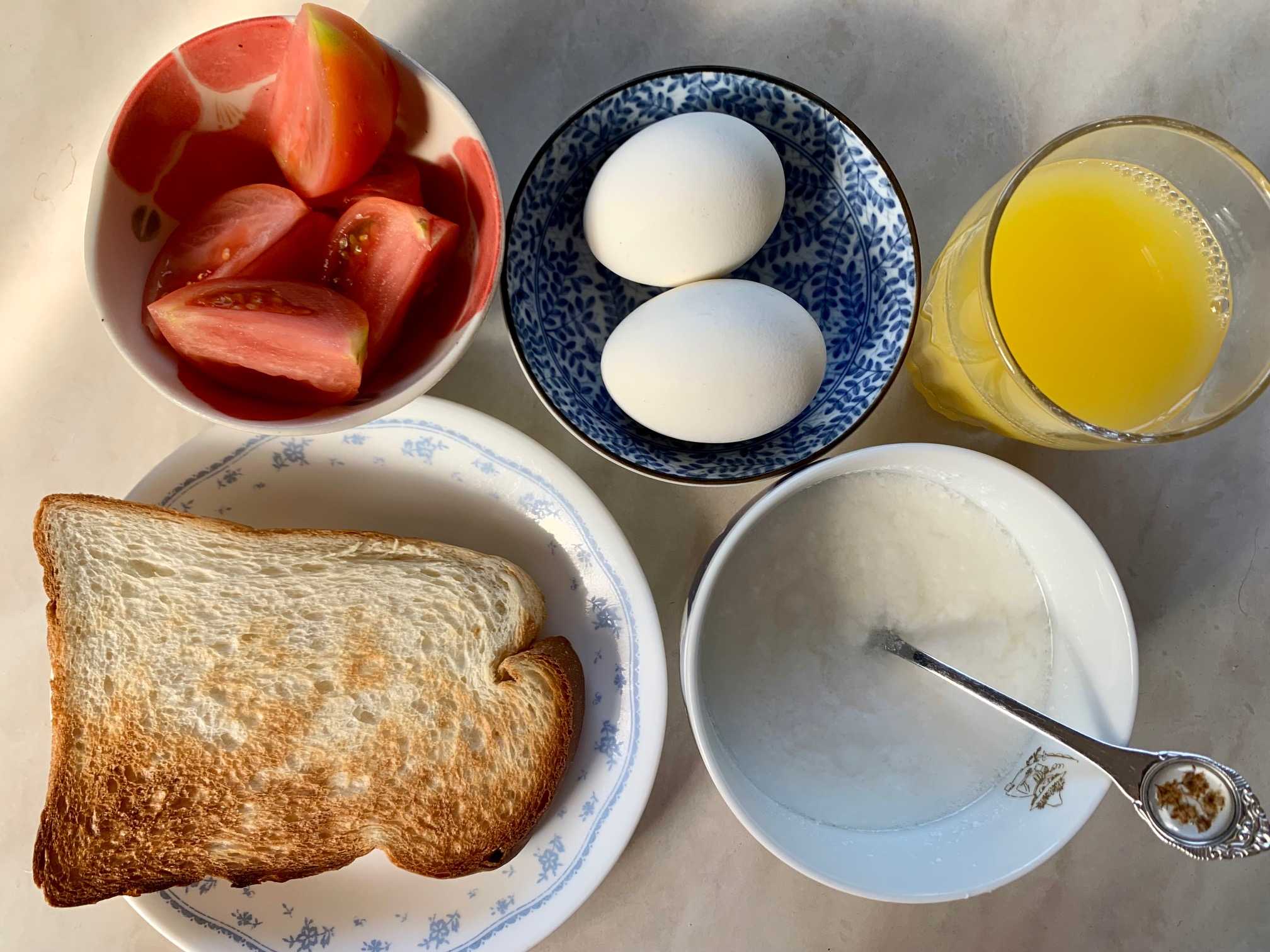 朝食は、トースト・発酵バター、トマト、ゆで卵、カスピ海ヨーグルト、オレンジジュース。