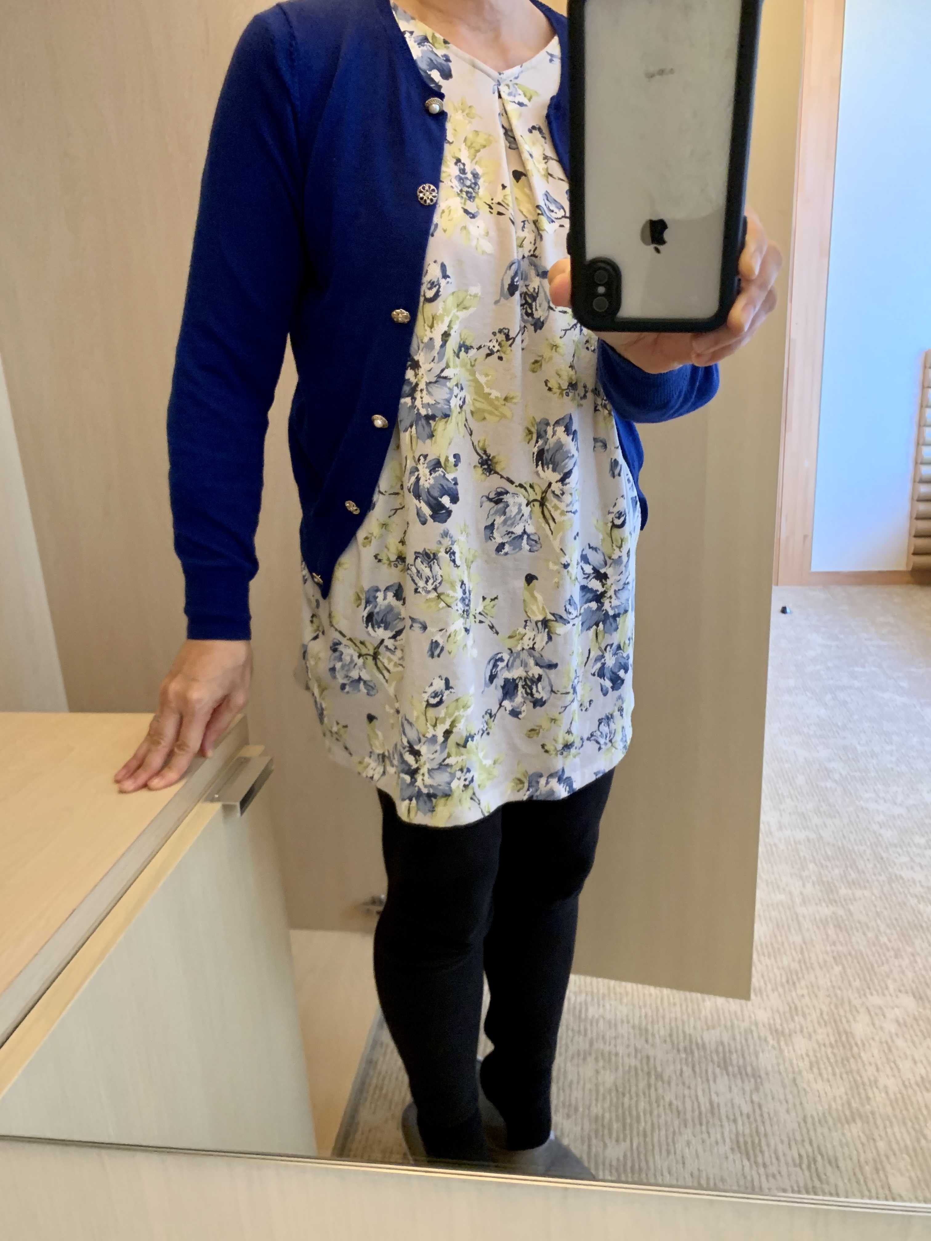 ダイエット食事日記5645日、山形旅行2日目。庄内ホテル・スイデンテラス、鶴岡公園、大寶館、鶴岡カトリック教会、松ヶ岡開墾場、出羽三山、羽黒山斎館で精進料理、高見屋最上川別邸紅。グレー・青・黄緑の花柄チュニック、青カーディガン、黒スパッツ、黒靴下、黒紐靴。
